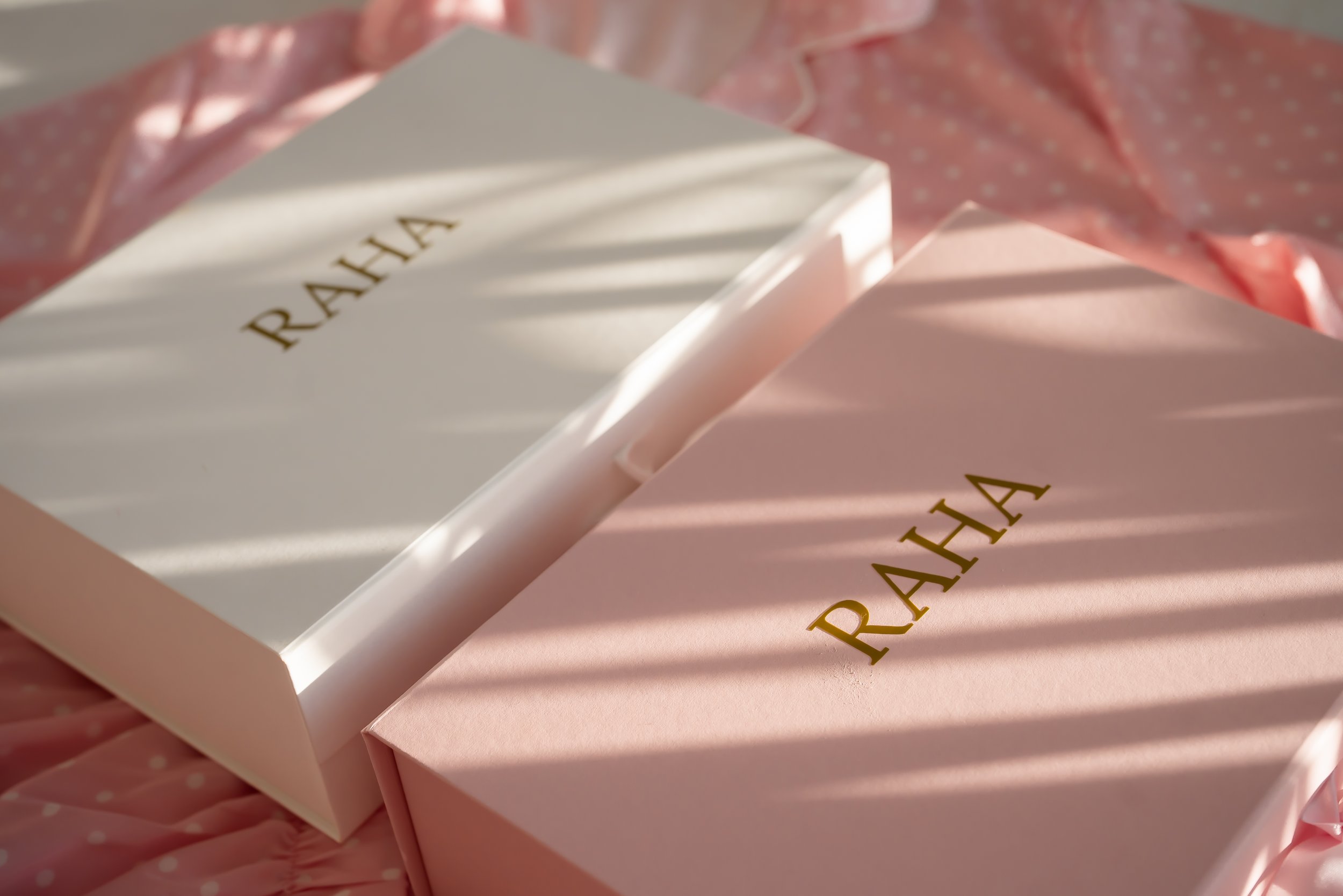 Every RAHA set arrives in a luxury keepsake box, wrapped in softly scented tissue and packed with love.